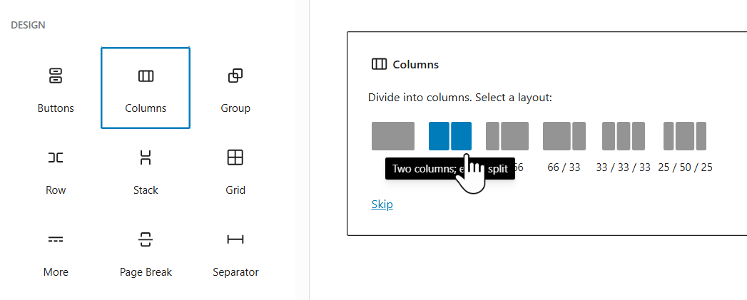 ► In sidebar scroll down to DESIGN and click the Columns icon.