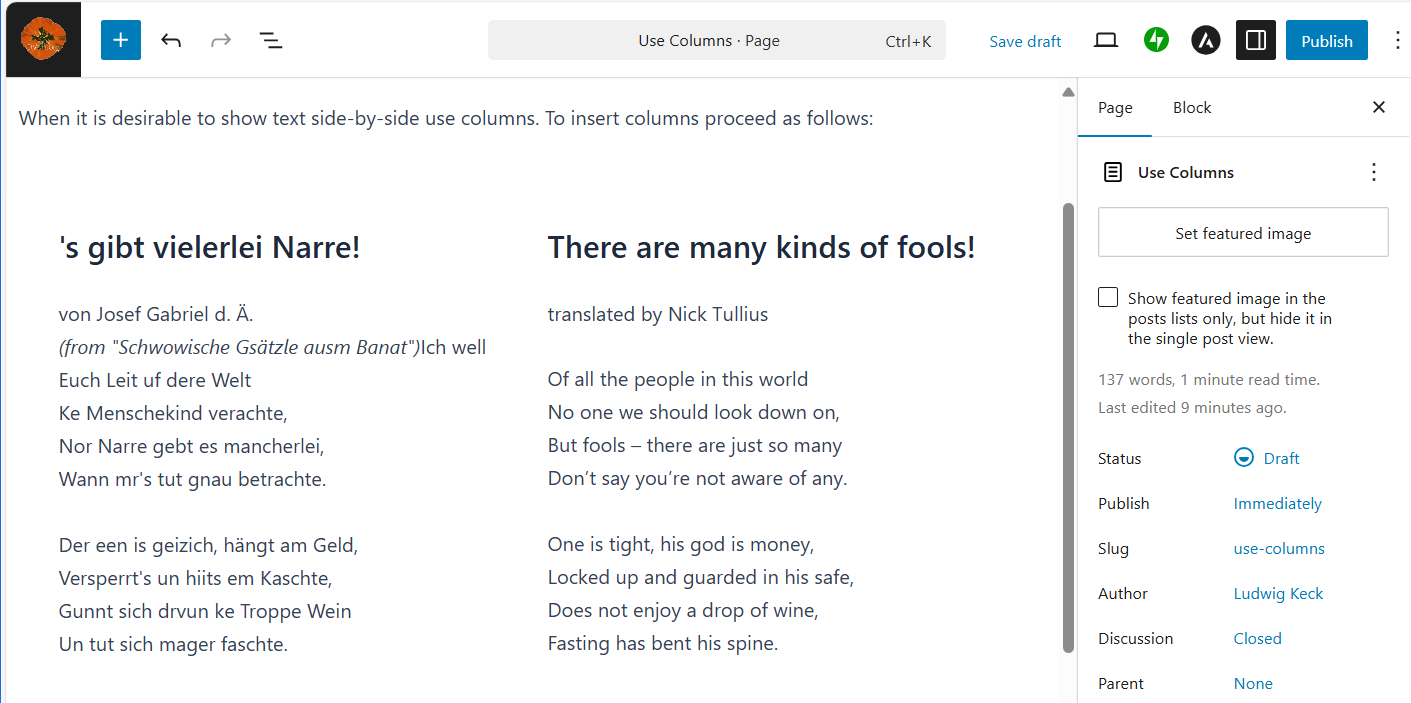 ► Move your cursor over the columns. The individual column block will show an outline. Click the + icon. Click the paragraph icon. Then paste the text, Ctrl-V.