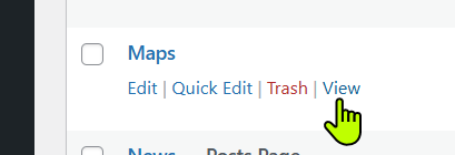 Then go back to the dashboard, click Pages. Right-click the View icon for the map page and select Open link in new tab.