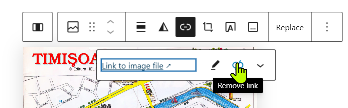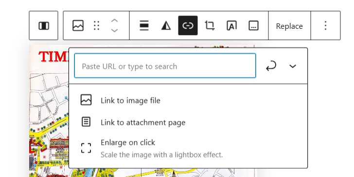 Inset the map into the new page just like any image (see Insert images if you need more detailed instructions). Click the link icon in the small toolbar. Click Link to image file. Publish the page.