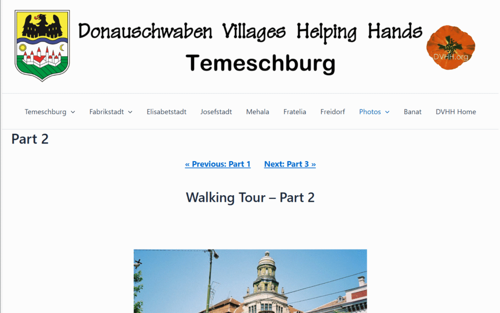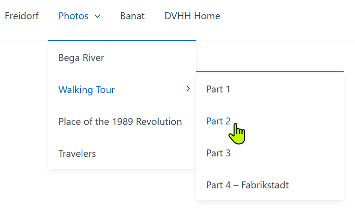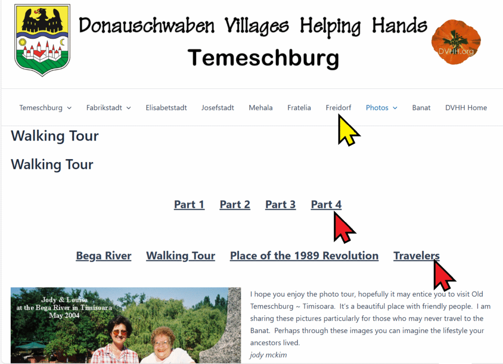 Many village pages have secondary menus. There may be several. See the menus on the Temeschburg website Walking Tour page as an example. The red arrows in the illustration above point to secondary menus.