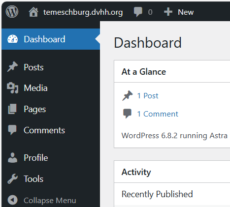 Open the old DVHH village site in a new tab. Before you start to copy material from the old site inspect the Home page there carefully. There should be a menu for navigating to other pages. The menu may be in the conventional place below the header, often it may be in a sidebar. Typically, there are pages like Home, History, Information, Research, Photos, etc.