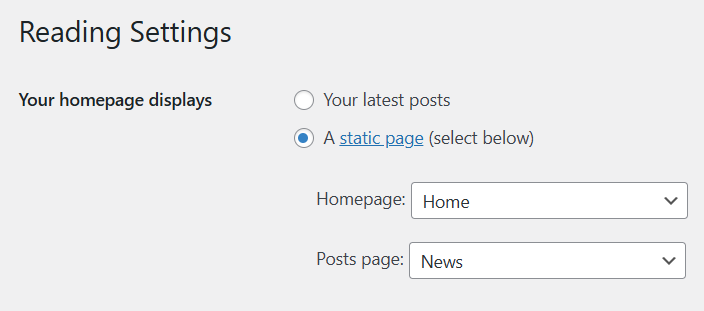 Go to Setting > Reading and set. Set Your homepage display to A static page. In the boxes set Homepage to Home and Posts page to News.
